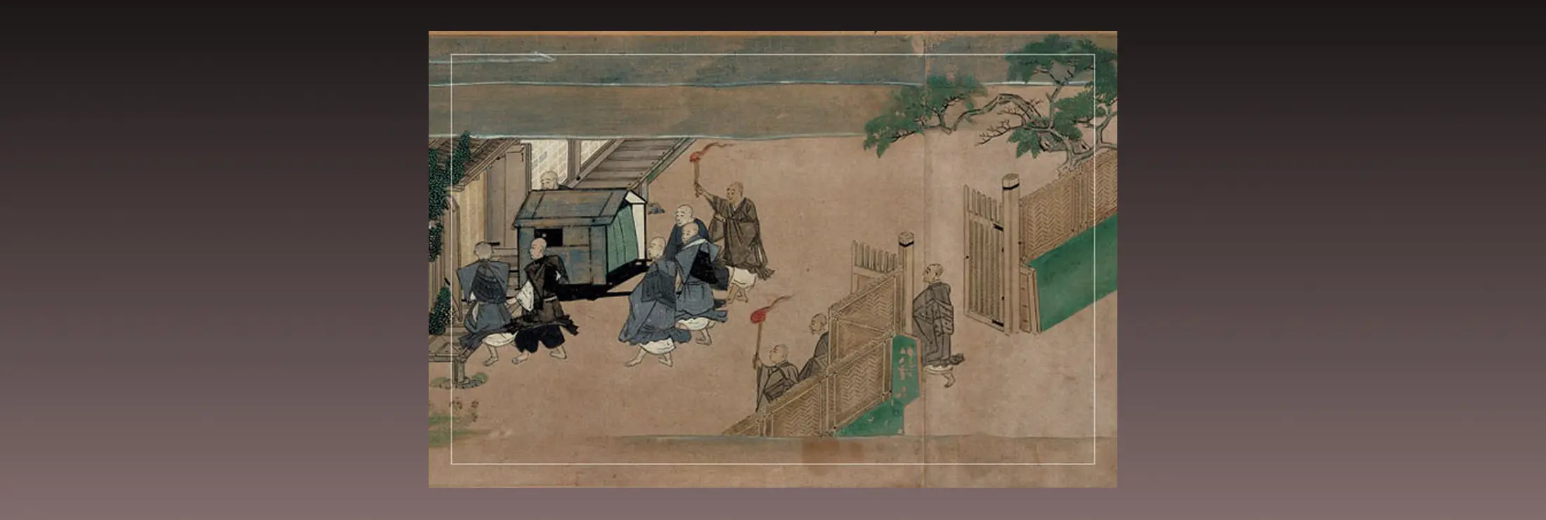 奥嵯峨二尊院から、広隆寺来迎房円空の住房(後に西光寺)に、法然上人のご遺骸をご移葬した場面です。知恩院所蔵 国宝 『法然上人行状絵図』 の第42巻第5段より、知恩院の許可を頂き掲載しています。