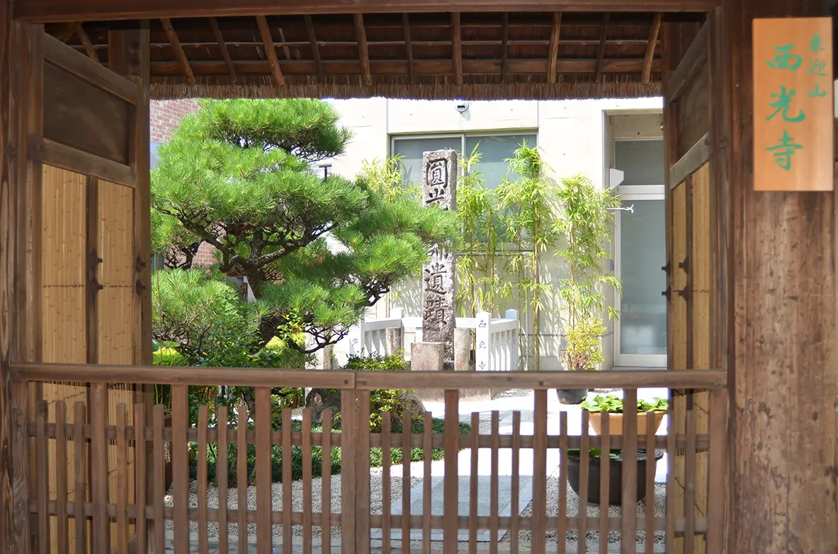 京都の洛西にある西光寺は、浄土宗の開祖 法然上人のご遺骸を約8ヶ月間 お隠してお護りした寺院です。 嘉禄3年(1227年)に、法然上人のお念仏の教えに反対した勢力が、大谷 (現知恩院)の法然上人のお墓を破壊して、そのご遺骸を鴨川に流すという 計画をしました。その企てを知ったお弟子達が、奥嵯峨の二尊院にご遺骸を 移して、お隠ししました。 しかし、すぐ知れわたりましたので、密かに当寺にお移ししました。そして、西光寺の開祖 来迎房圓空上人が、翌年の1月25日まで、ご遺骸をお護りしました。その後ご遺骸は、京都の西山の粟生野(後に光明寺)で、茶毘(火葬)に伏されました。 山門は、嘉禄の法難当時が偲ばれるように茅葺造りです。中央に、尋声という額があります。尋とは「たずねる」という意味があり、お念仏の声が偲ばれる寺院ということから命名しています。